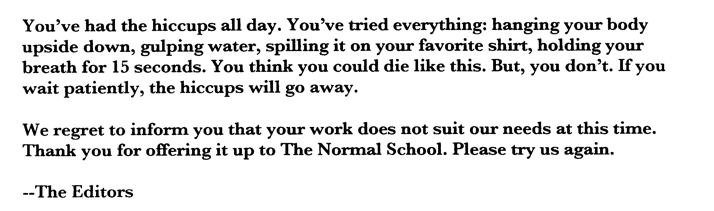 I often show the letter to my creative writing students, who are understandably eager to submit their writing and see it in print. It never fails to make an impression. In the stunned silence after I finish reading the letter aloud, I tell them that the first rule of submitting your work is to know your audience -- to become familiar with the magazine before you submit to it, not after. And I tell them to ask themselves if they're ready to receive a letter like this one.Here's a transcript of the rejection, which is a little hard to read:
